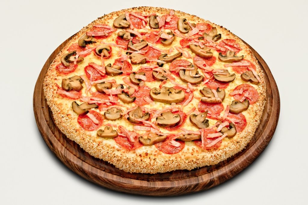 Queso gouda, tocino, pepperoni y champiñones