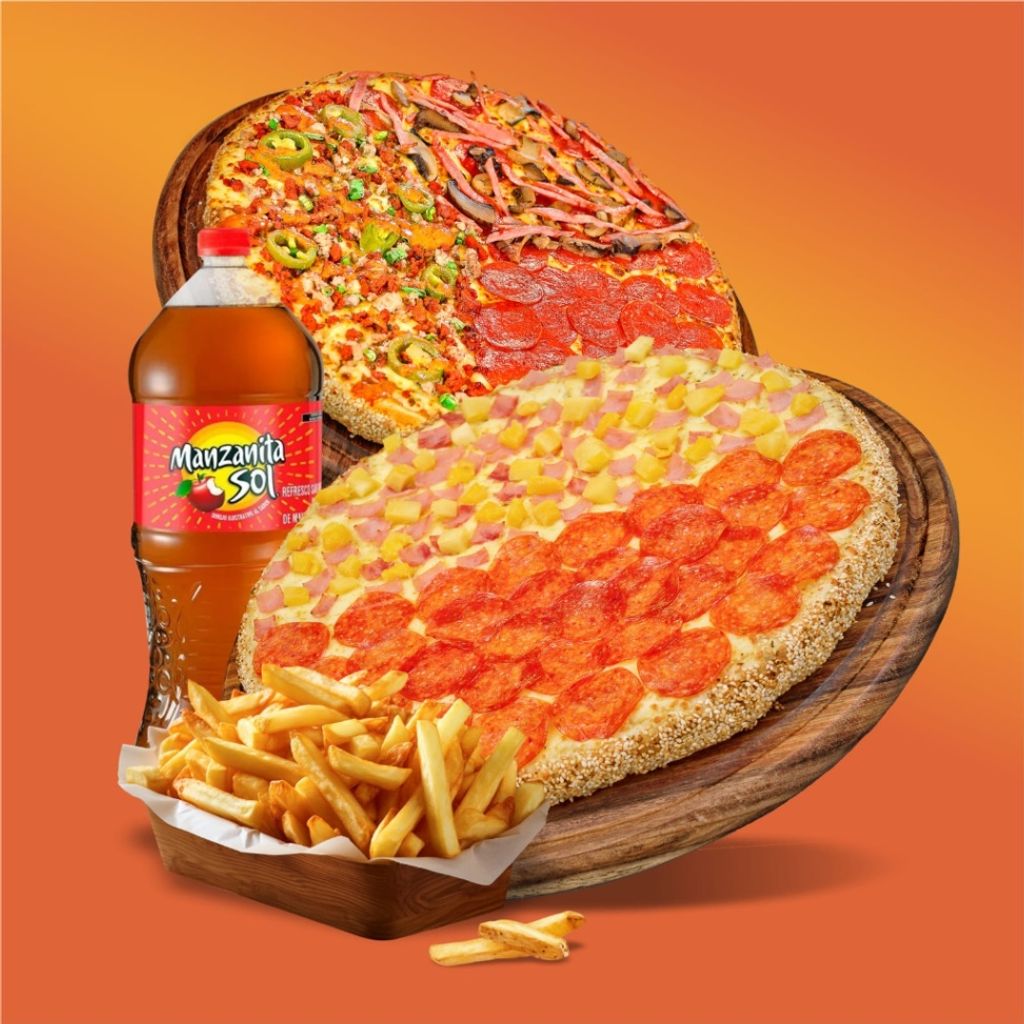 1 Pizza Hawaroni Familiar + 1 Pizza Triple Max Familiar + 1 Orden de Papas a la Francesa + 1 Refresco de 2 lts.