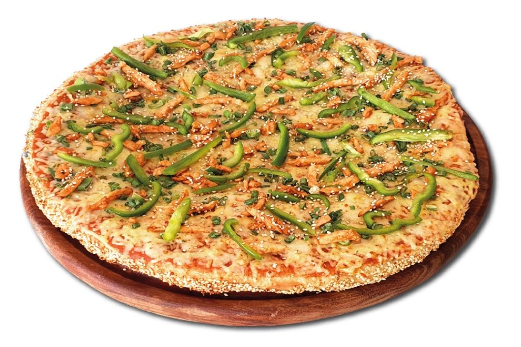Queso gouda, pechuga de pollo con salsa mango habanero, cebollín, morrón y ajonjolí tostado encima