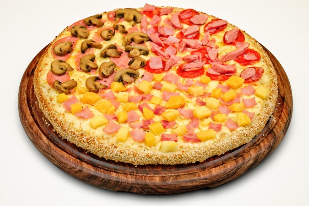Un tercio de hawaiiana, un tercio de carnes frías y un tercio de salami con champiñon